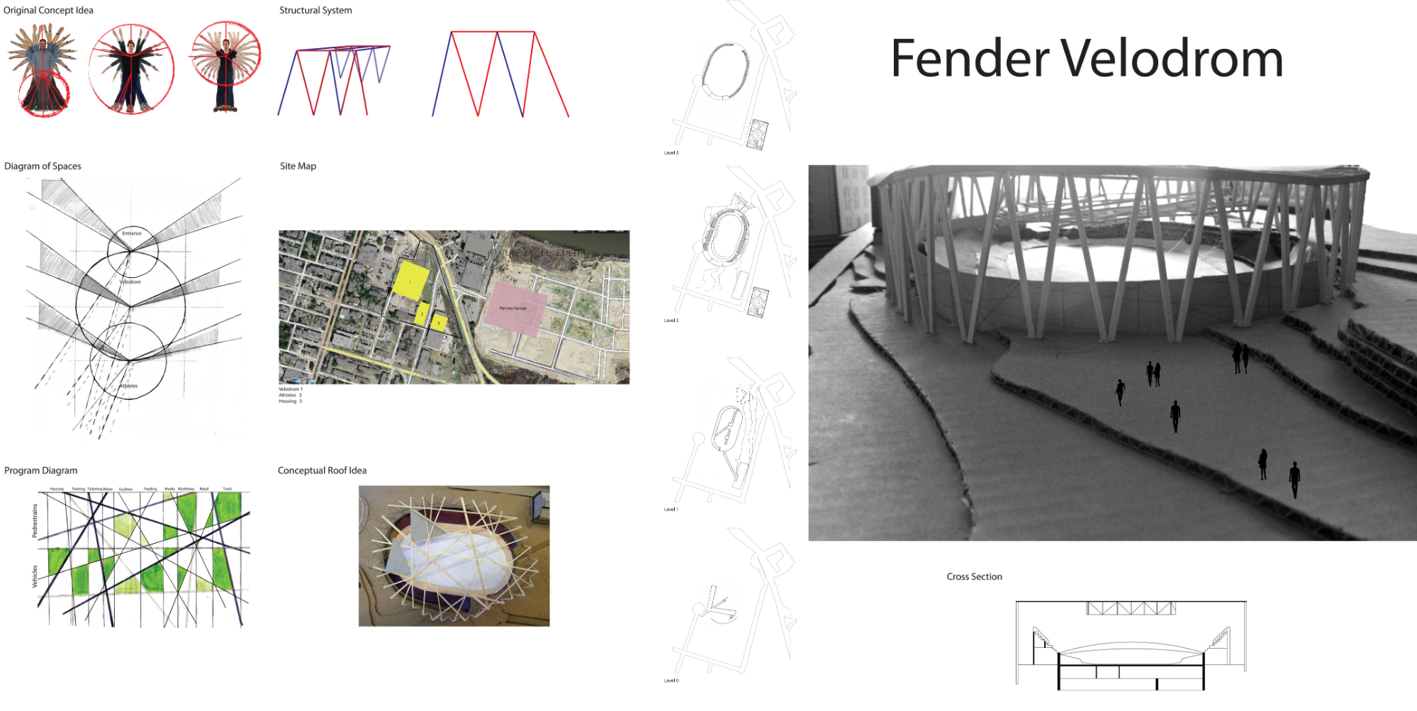 This project reimagines an Olympic‑scale velodrome for the city of Savannah, designed for a challenging site at the edge of the historic district. Drawing from Savannah’s iconic grid and square system, the proposal overlays the city’s rigid geometry with the fluid proportions of the human body—research that originated from an independent study on spatial relationships and classical anatomical systems such as the Vitruvian Man. The result is a velodrome whose form balances structure and movement, precision and rhythm, much like the musical instrument that inspired its name.