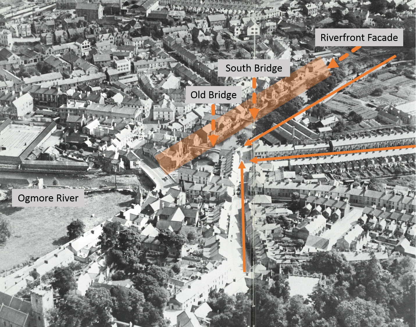 This study examines the historic town centre of Bridgend, Wales—an area rich in heritage yet challenged by declining activity, limited business hours, and a streetscape that no longer supports the vibrancy it once had. Anchored by the Ogmore River and a network of historic streets, the district contains centuries of architectural layers, from the fifteenth‑century stone bridge to listed buildings that once framed a thriving market town. Over time, infrastructural changes, canalization, and shifting commercial patterns have altered the fabric of the centre, leaving key gateways underutilized and the riverfront disconnected from daily life.
